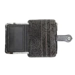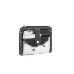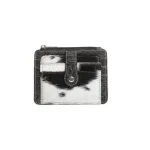 Indulge in wild sophistication with this beautiful wallet. The front showcases luxurious black and white hair-on hide, while the back boasts intricate embossed leather artistry. Inside, find ample card slots and a convenient ID window. Compact yet spacious, this wallet marries untamed beauty with practical elegance for the modern, style-conscious woman. Snaps closed.