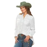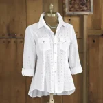 This classic eyelet shirt has extra-feminine details. Floral-embroidered fabric is lightweight. Back panel adds style and comfort, while front seaming creates a great fit. Button front, flap pockets and roll tab sleeves. Back Western yoke. 28" long in size medium. 100% cotton. Hand washable.