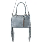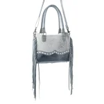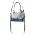 Embrace safety and style with this premium western concealed carry purse. This compact bag is constructed from a high percentage of genuine leather, highlighted by a section of soft grey/ashy hair-on cowhide for rich texture. The lower section and handles feature distressed olive-green leather with an embossed pattern, adding a sophisticated, rugged touch. The bold, sweeping fringe on both sides makes a striking fashion statement, while the structured silhouette of this functional CCW bag ensures you are always prepared.