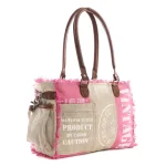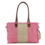 Treat yourself to the amazing presentation of this great bag! It dimensional style and adventurous motifs features woven canvas in duo-tones of light sandstone and luscious pink, along with special leather side accents, and frayed-edge treatments. Overprint alludes to adventures abroad via mysterious cargo. Zipper-close top. The back is duo-color canvas. A wonderful fashion statement in a fun package!